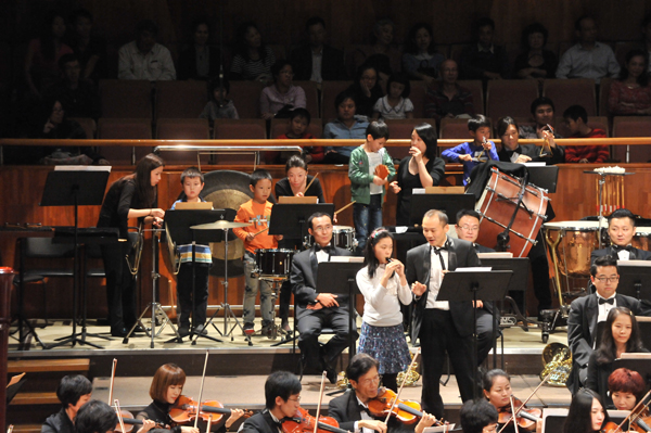 一曲《梁祝》排练结束,余隆更化身“孩子王”,请出5位踊跃举手的小观众上台,和乐团一起完成莫扎特的《玩具交响曲》。于是小观众在乐团叔叔阿姨手把手的现场教学下,有的吹起迷你小号,有的敲起架子鼓和三角铁,玩得不亦乐乎。两遍演完,余隆还带着“小乐手”们学习鞠躬谢幕等舞台礼仪。