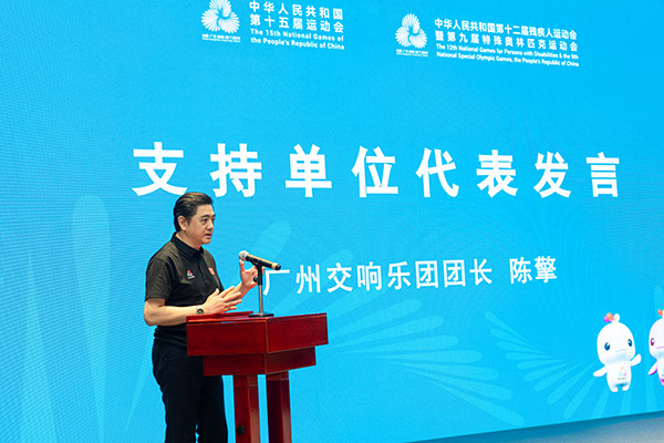 仪式上,广州交响乐团、广东民族乐团、广州体育学院、酷狗文化正式获颁“十五运会和残特奥会体育展示音乐库杰出贡献单位”。广州交响乐团团长陈擎作为贡献单位代表发言。他表示,能以其艺术资源为国家级体育盛会贡献力量倍感荣幸,各支持单位通力合作,共同为赛会注入了丰沛而优质的声音能量。
